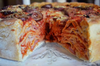 - Iniziare a farcire cominciando col pomodoro e continuando con la scamorza (o provola o mozzarella) prosciutto e wurstel;