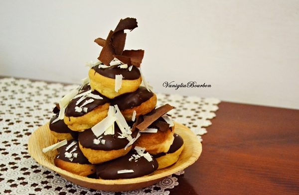 - Glassare la superficie del bignè col cioccolato precedentemente fuso a bagnomaria (io preferisco glassare solo la superficie, potete benissimo glassarli completamente);
