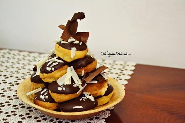 - Glassare la superficie del bignè col cioccolato precedentemente fuso a bagnomaria (io preferisco glassare solo la superficie, potete benissimo glassarli completamente);