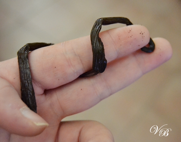 Dimenticavo, uno dei modi per riconoscere una buona Vaniglia sta nell’attorcigliare la bacca attorno al dito (vedi foto in basso), questo indica che la bacca contiene abbastanza polpa. La secchezza, invece, indica che il prodotto è di qualità minore.