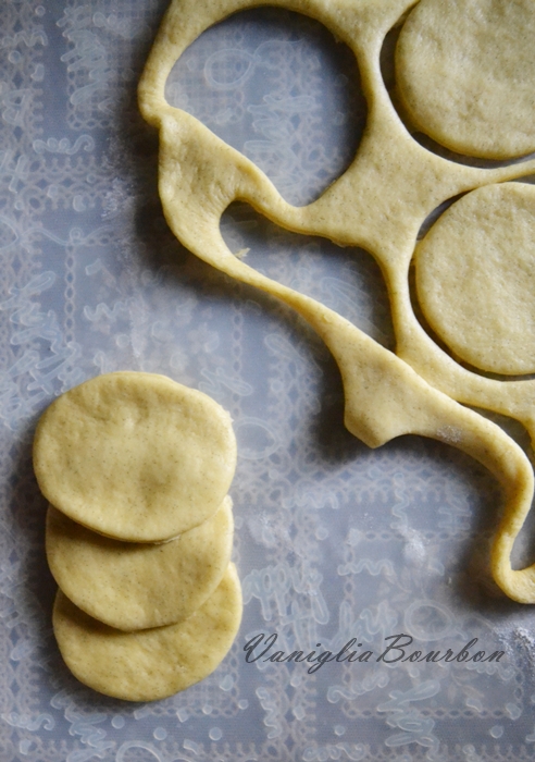 - Appena l’impasto sarà raddoppiato, stenderlo a circa mezzo centimetro di altezza e ricavare dei cerchi con un coppapasta da 8 cm;