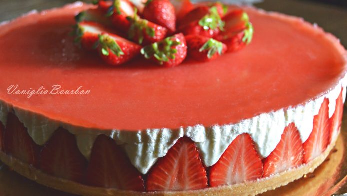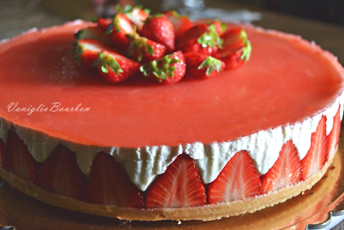 In questo caso il fondo biscottato l’ho aromatizzato al miele, la crema è composta da mascarpone, formaggio spalmabile, yogurt e vaniglia, la gelatina è ottenuta da fragole frullate, il tutto abbellito da fragole fresche.