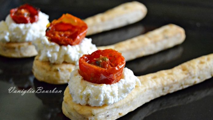 I cucchiaini di brisèe, crema di ricotta e pomodorini confit sono un appetizer stuzzicante e intrigante.