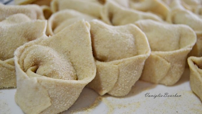 I tortelloni sono composti da una pasta fresca all’acqua senza uova e da una farcia con caciocavallo e timo.