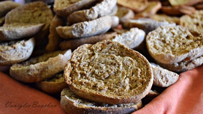 - Prelevare dal forno le frise pugliesi integrali alla birra, tagliarle a metà longitudinalmente e riporle per altri 20-25 minuti. Devono “biscottarsi” per bene per acquisire croccantezza.