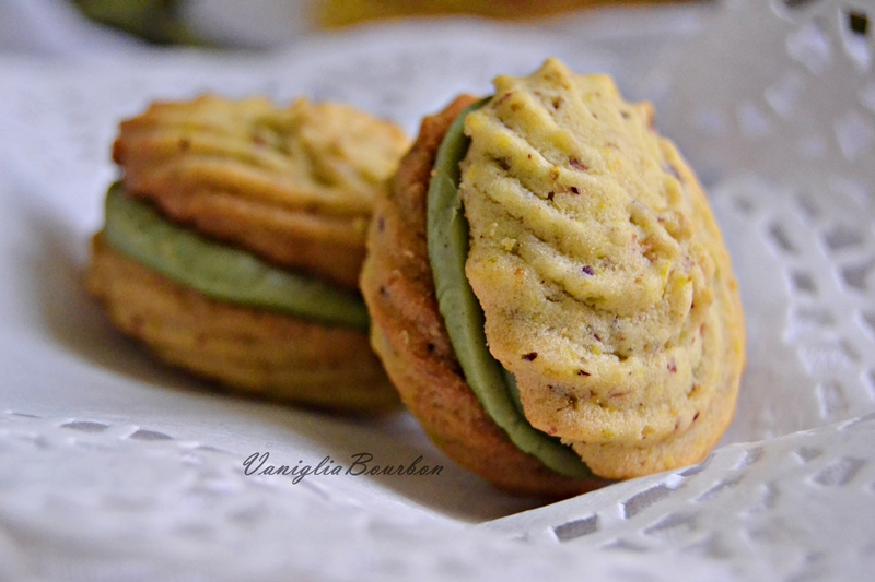 I biscottini di frolla montata al pistacchio dovranno risultare leggermente dorati; - Raffreddati, potete gustarli accompagnati col vostro thè/tisana/caffè preferiti spolverizzati semplicemente con dello zucchero a velo oppure accoppiarli come ho fatto io.