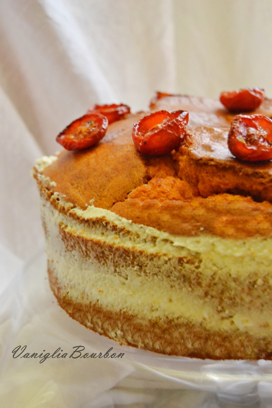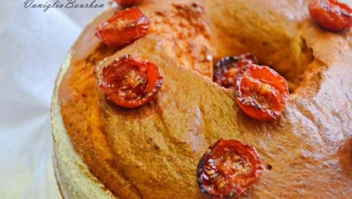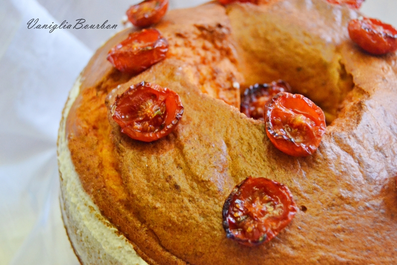 - Completare la chiffon cake salata con dei pomodorini confit;